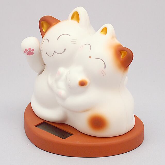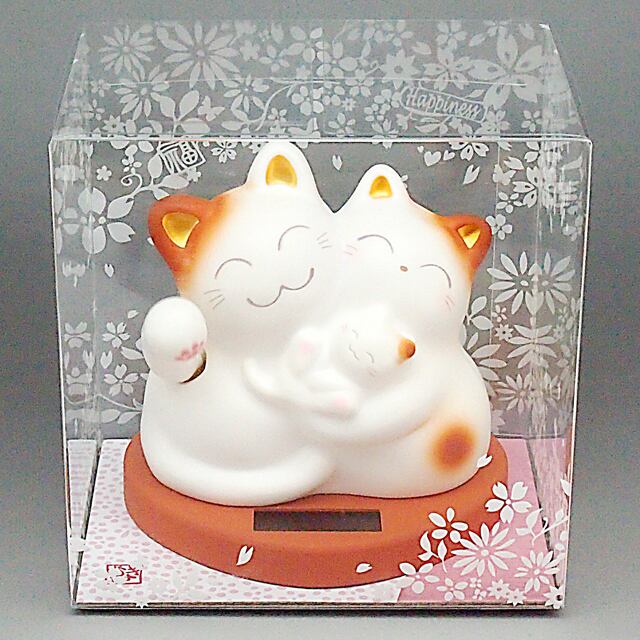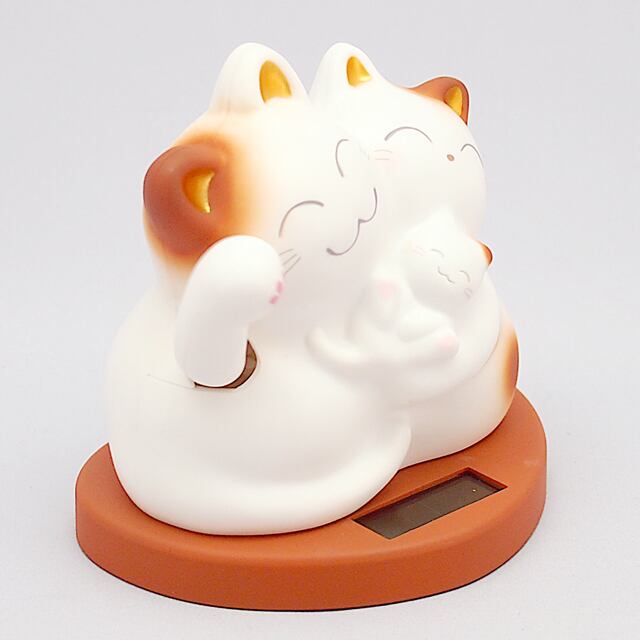 The Mugyutto Shiawase Manekineko is a three parent and child cat snuggled together. They are riding on a heart-shaped pedestal, waving a hand and bringing happiness to you.