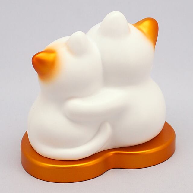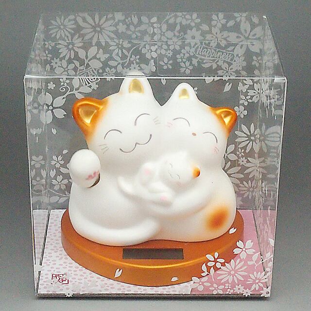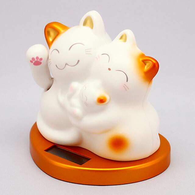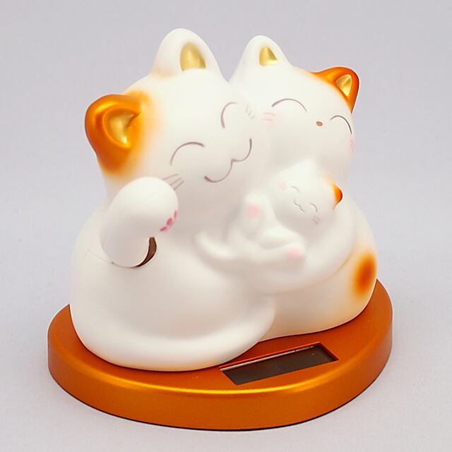The Mugyutto Shiawase Manekineko is a three parent and child cat snuggled together. They are riding on a heart-shaped pedestal, waving a hand and bringing happiness to you.